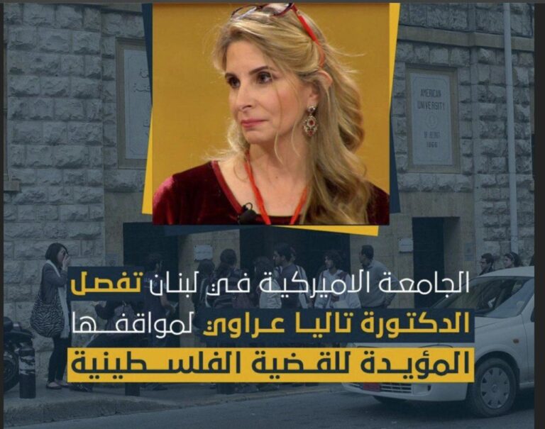 في خطوة غير مسبوقة، قامت الجامعة الأميركية في بيروت، بفصل الدكتورة تاليا عراوي، لموقفها المؤيد للقضية الفلسطينية والرافض للهمجية التي تمارس على غزة.