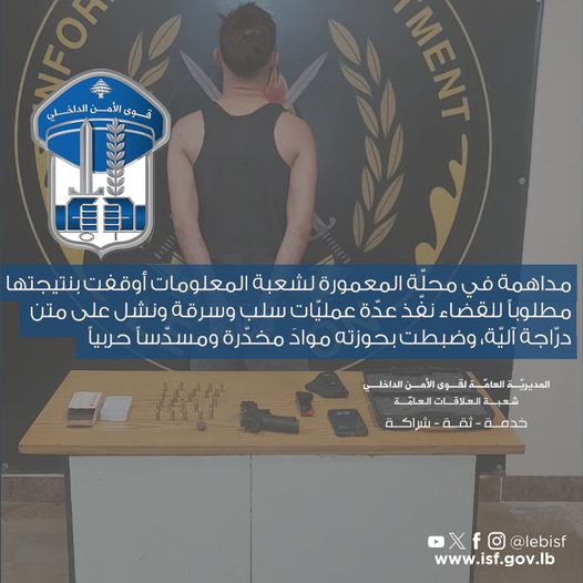 “في إطار المتابعة اليوميّة التي تقوم بها قوى الأمن الدّاخلي للحدّ من جرائم السّرقة والنّشل في مختلف المناطق اللّبنانية وملاحقة المتورّطين بها وتوقيفهم، توافرت معطيات لشعبة المعلومات حول قيام شخصٍ مجهولٍ، على متن دراجة آليّة بتنفيذ عمليّات نشل وسرقة وسلب في العديد من المناطق في بيروت وجبل لبنان.