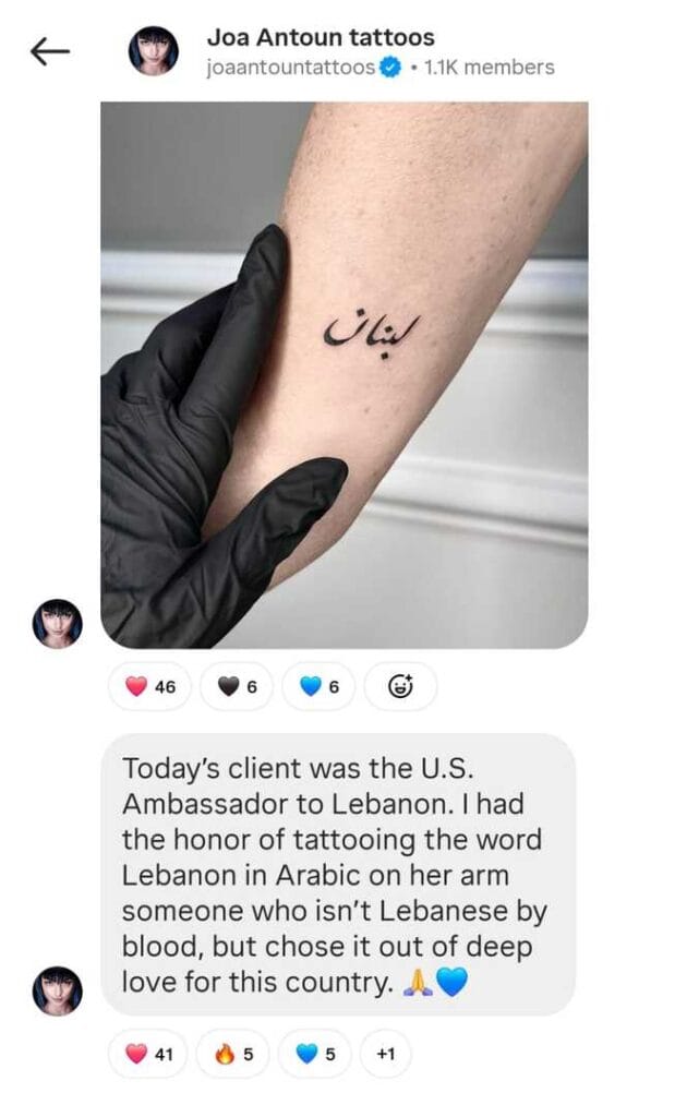ونشرت أنطون صورة الوشم عبر خاصية “القناة” على حسابها في “إنستغرام”، وأرفقتها بتعليق قالت فيه: “كانت زبونتي اليوم السفيرة الأميركية لدى لبنان. تشرّفت بوشم كلمة ‘لبنان’ باللغة العربية على ذراعها.. امرأة ليست لبنانية الدم، لكنها اختارت هذا الوشم بدافع حبّ عميق لهذا البلد”.