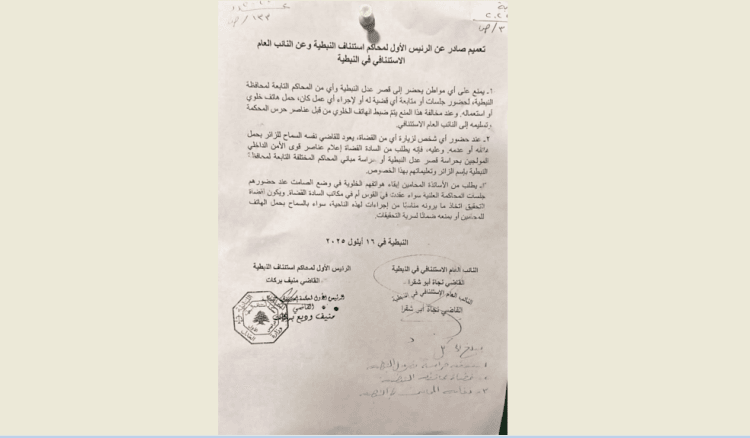 “1- يمنع على أي مواطن يحضر إلى قصر عدل النبطية، وأي من المحاكم التابعة لمحافظة النبطية، لحضور جلسات أو متابعة أي قضية له أو إجراء أي عمل كان، حمل هاتف خلوي أو استعماله. وعند مخالفة هذا المنع يتم ضبط الهاتف الخلوي من قبل عناصر حرس المحكمة وتسليمه إلى النائب العام الاستئنافي.