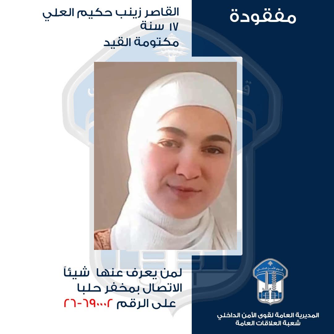 تُعمِّم المديريّة العامّة لقوى الأمن الدّاخلي بناءً على إشارة القضاء المختصّ صورة المفقودة القاصر: