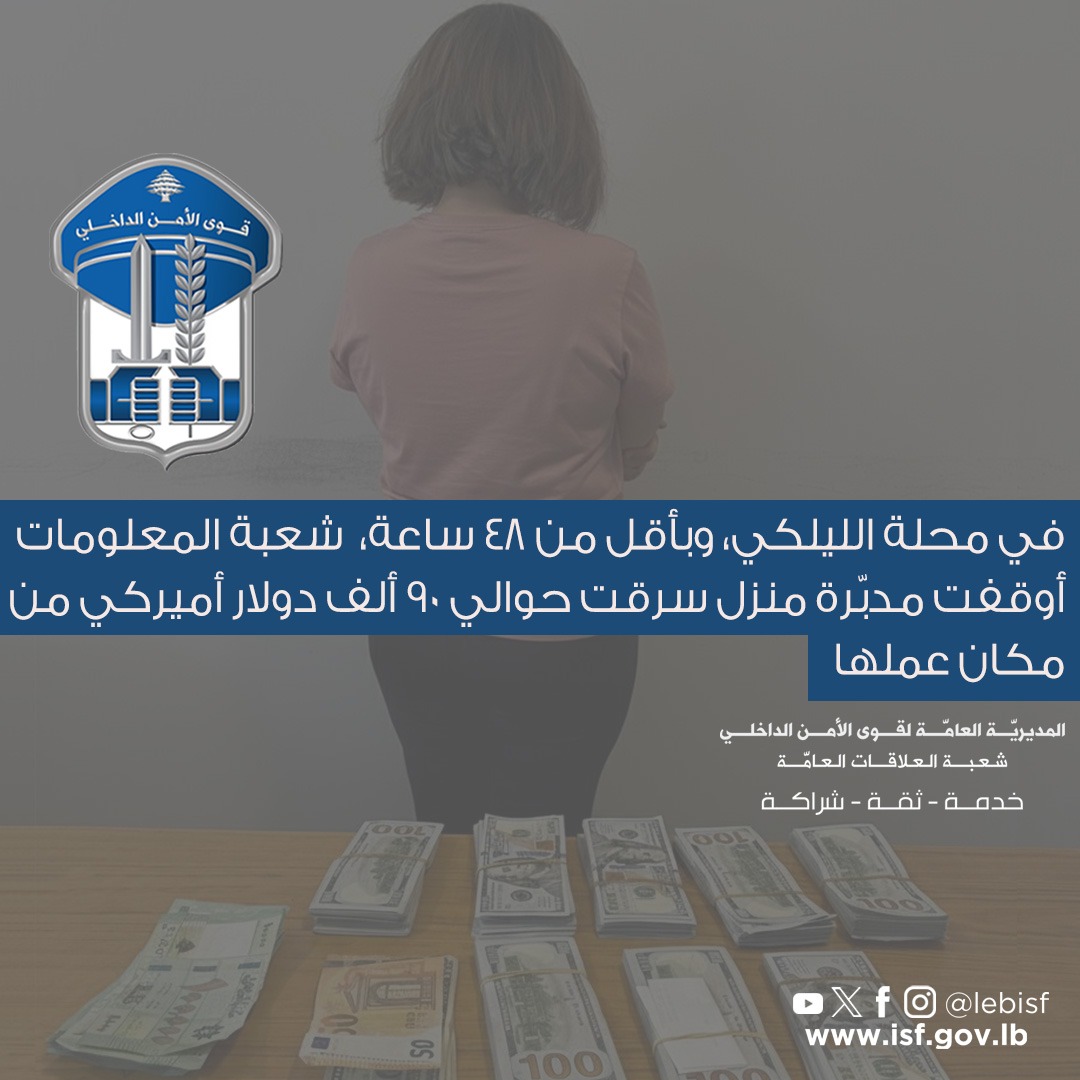 بتاريخ 13-10-2025، وبنتيجة المتابعة التّقنيّة والاستعلاميّة التي قامت بها القطعات المختصّة في الشّعبة، توصّلت إلى تحديد مكان اختباء المشتبه فيها في محلّة الليلكي، حيث نفّذت قوّة من الشّعبة مداهمة للمكان المذكور، وتمكّنت من توقيفها وضبط مبلغ 76,491 دولارٍ أميركي.