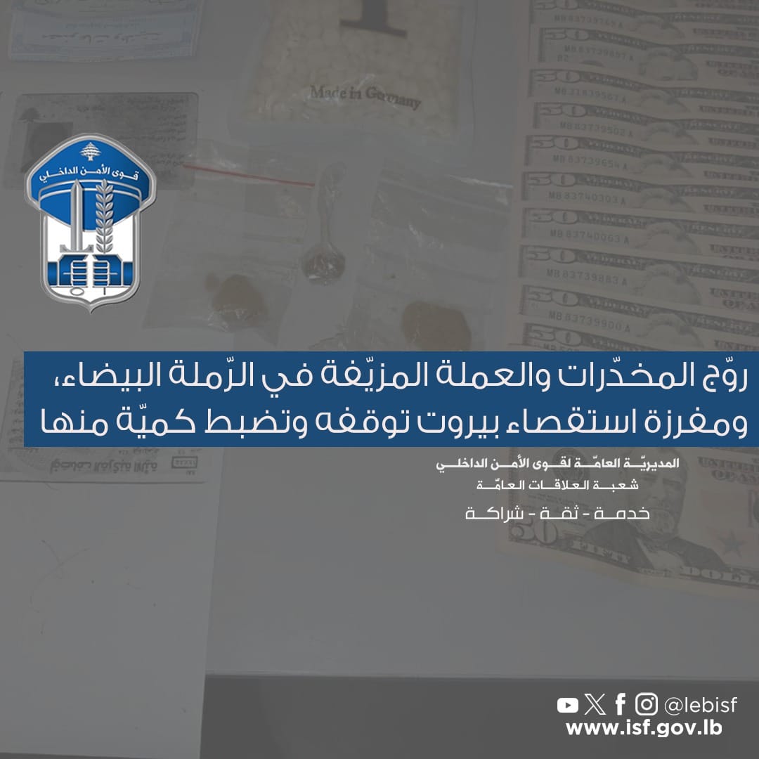 في إطار المتابعة المستمرّة التي تقوم بها قوى الأمن الداخلي لمكافحة الجرائم كافة على جميع الأراضي اللبنانية وتوقيف مرتكبيها، ولا سيّما تلك المتعلقة بعمليات تجارة وترويج المخدِّرات، توافرت معطيات لمفرزة استقصاء بيروت في وحدة شرطة بيروت حول قيام شخص بترويج مخدِّرات وعملة مزيّفة في محلة الرملة البيضاء