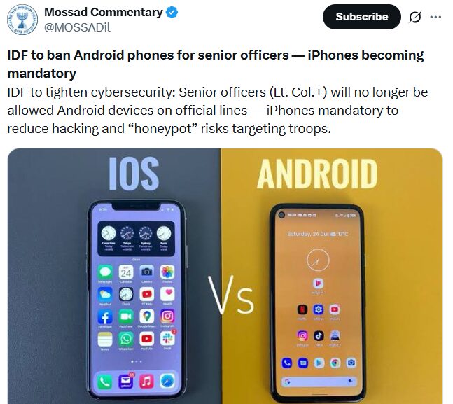 شدد جيش الاحتلال الإسرائيلي من إجراءات أمن المعلومات، موسّعًا دائرة منع استخدام أجهزة الهواتف الذكية التي تعمل بنظام “أندرويد” في صفوف ضباطه من رتبة مقدّم فما فوق، ومُلزمًا باستخدام أجهزة “آيفون” فقط في المهام العسكرية، منعا لتسرّب معلومات حساسة.