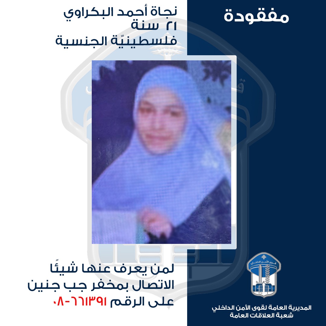 تُعمِّم المديريّة العامّة لقوى الأمن الدّاخلي، بناءً على إشارة القضاء المختص، صورة المفقودة: