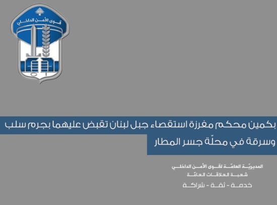 في إطار المتابعة المستمرّة التي تقوم بها #قوى_الأمن الداخلي لمكافحة جميع أنواع الجرائم في مختلف المناطق اللبنانيّة وتوقيف مرتكبيها، وبعد تزايد عمليات سلب الدرّاجات الآليّة والسّرقة على طريق المطار، توافرت معلومات لعناصر مفرزة استقصاء جبل لبنان في وحدة الدّرك الإقليمي عن تواجد شخصَيْن من أصحاب السّوابق بجرائم السّلب والسّرقة في محلّة جسر المطار.